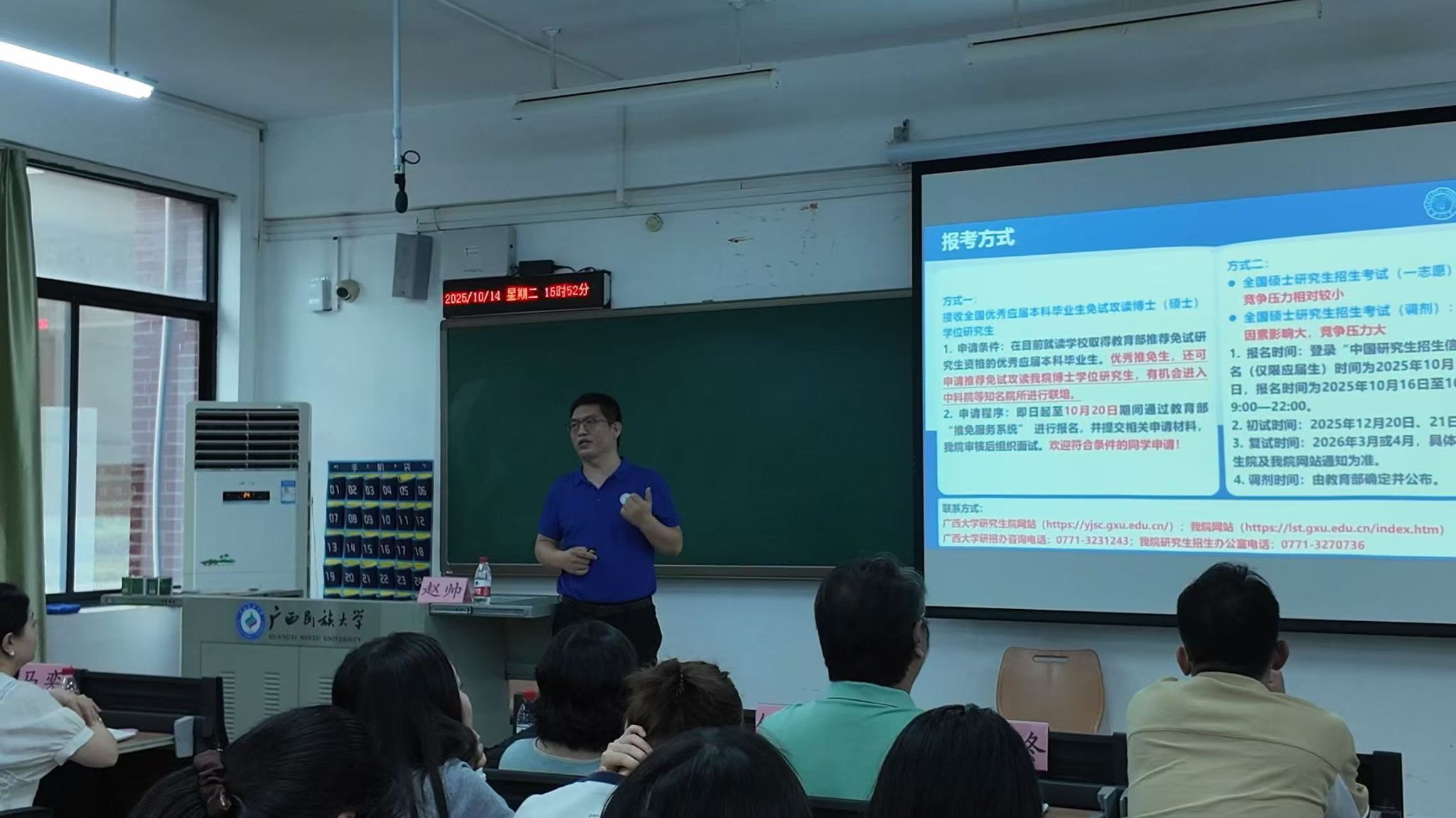 在精彩的学术分享后,赵帅教授向在场的师生介绍了广西大学生命科学与技术学院的研究生招生与培养情况,以及该院在生物学、生物与医药等专业领域的学科优势,并希望与我院进一步加强合作。