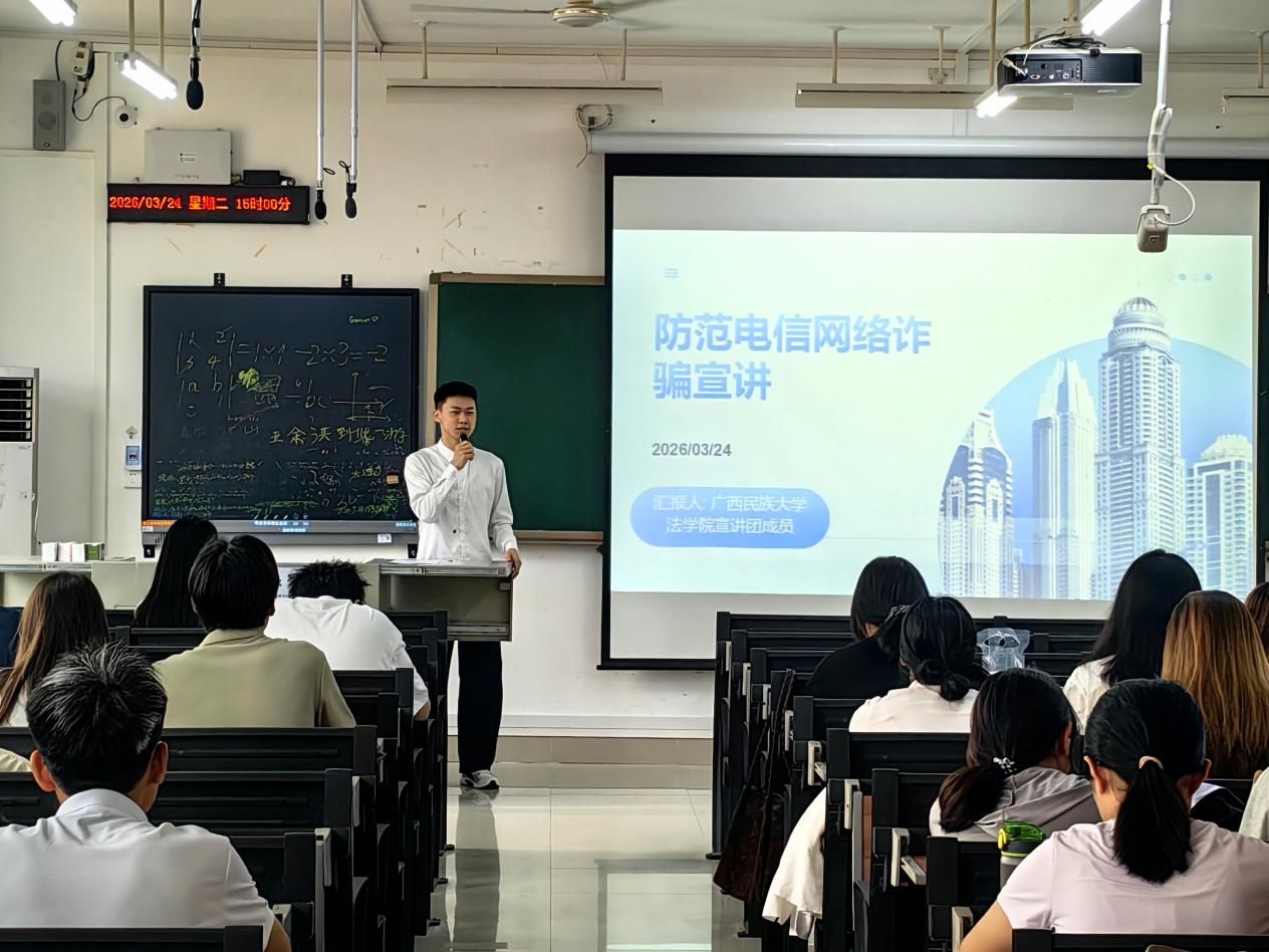 为进一步增强学生的反诈意识,提升识别与防范能力,筑牢校园安全防线,营造安全、和谐、稳定的校园环境,我院于3月24日下午在明德楼教室组织开展了防范电信网络诈骗宣讲会。本次活动邀请广西民族大学法学院宣讲团成员担任主讲,共设7场次,我院大一至大三年级全体在校生共800余人参加。